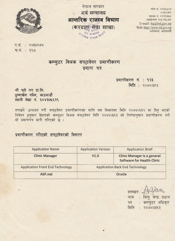 Clinic Manager is Inland Revenue Department (IRD) approved online web-based software, providing service since 2073 BS. Following different upgradation in the system it has come up with sequential new versions with user friendly look and feel. From its production date Clinic Manager has been used in small clinics to big hospitals with large volume of transactions. Clinic manager have stand prominent in the field of health sector due to its ability of generating different constructive reports assisting user to save time and money.